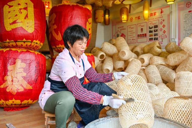在合作社生产区,伴随着扑鼻而来的淡淡竹香,只见一根根竹篾条在工人师傅的巧手中变了“模样”,编制成胚、糊纸、烘干……经过一系列工序,竹编灯笼制作完成。
